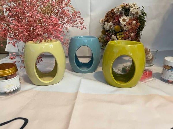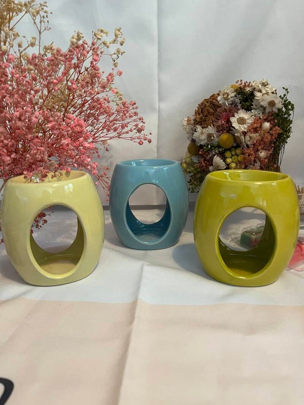 👉 Modèles colorés et ronds : En jaune tendre, bleu ou vert olive, ces brûle-parfums aux formes douces créent une ambiance chaleureuse et cosy. Leur design simple et pastel s’adapte à toutes les décorations et sublime vos fondants parfumés tout en douceur.